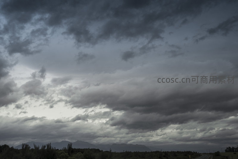 厚重的乌云笼罩着天空,远方山脉在灰暗中若隐若现,地平线处的植被勾勒出大地轮廓,营造出宁静而略带压抑的自然氛围。