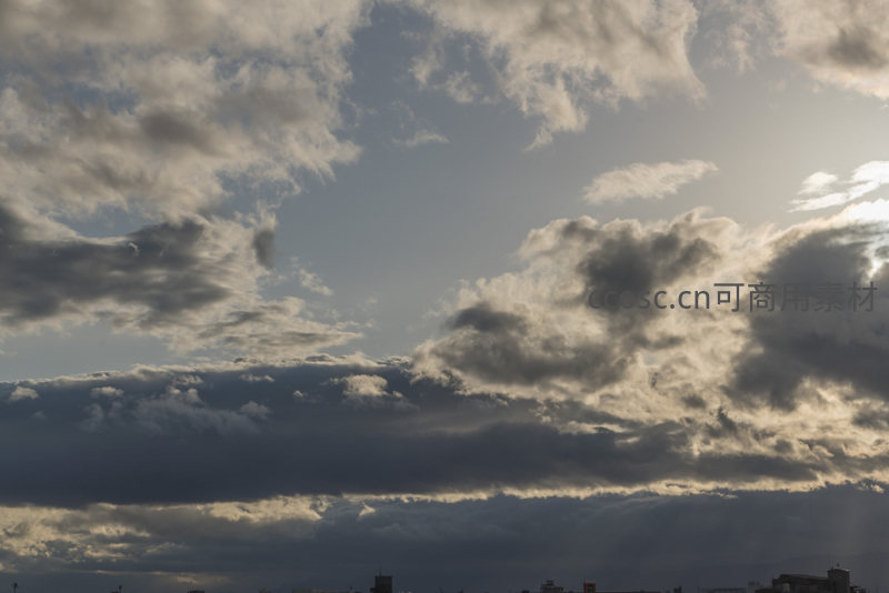 金色阳光从厚重云层缝隙中洒落,为城市天际线镀上暖光,云朵层次分明,明暗对比强烈,展现都市黄昏时分的壮丽与诗意。