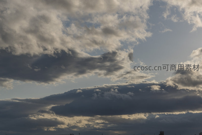 大片云朵在城市上空缓缓流动,阳光在其边缘勾勒出柔和金边,下方建筑轮廓隐约可见,呈现出动态与静谧交织的都市天空画卷。