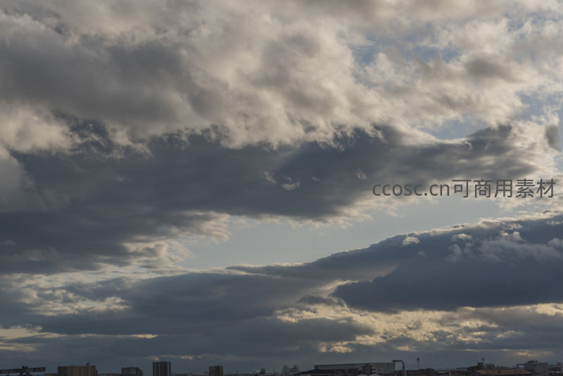层层叠叠的云朵覆盖天空,部分区域透出微光,城市建筑群在云影下若隐若现,展现出一种沉静而富有层次感的现代都市气象景观。