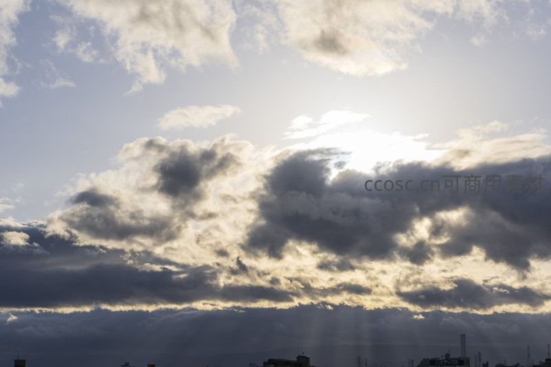 厚重的云层中透出温暖的金色阳光,洒向下方的城市建筑群,形成强烈的明暗对比,营造出戏剧性的视觉效果。