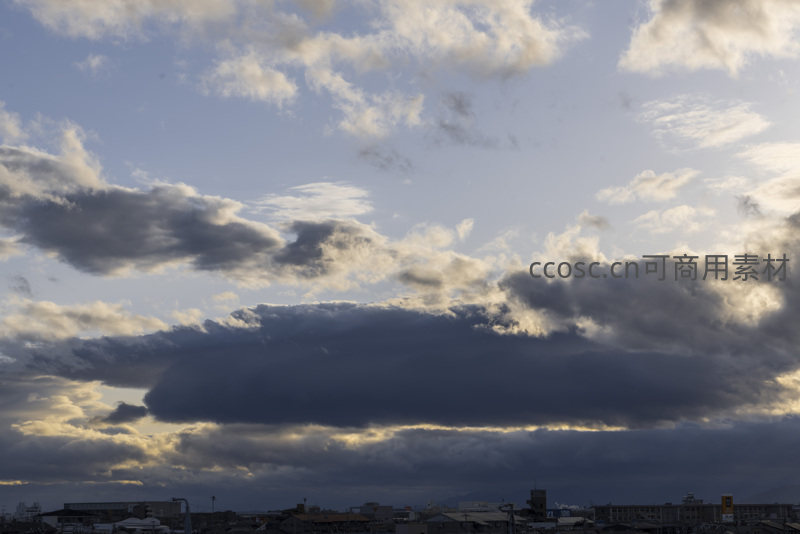 一片巨大的深色云团低垂于城市上空,边缘被夕阳勾勒出金边,仿佛一块巨大的幕布即将落下,气势磅礴。