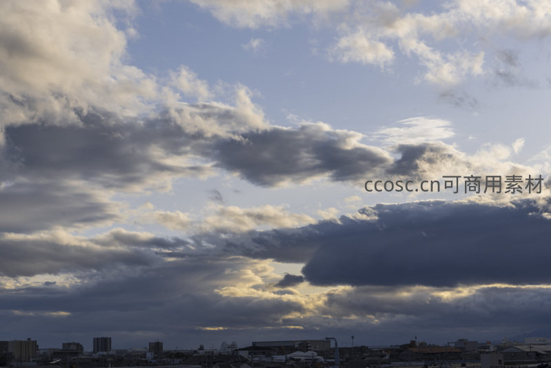 厚重的云层在夕阳余晖下呈现出深浅不一的灰蓝色调,阳光穿透云隙洒向城市,勾勒出建筑轮廓,营造出戏剧性的光影效果。