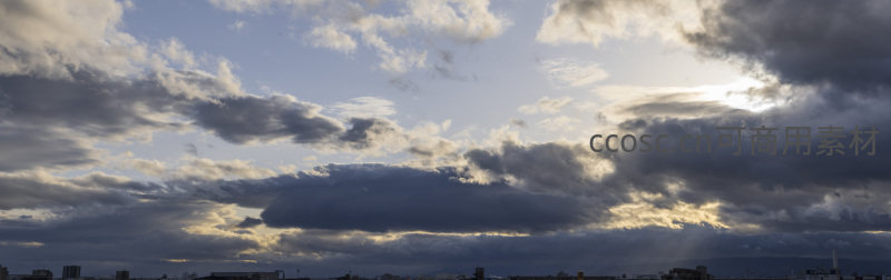 宽幅视角捕捉了城市上方翻滚的云海,金色阳光从云层缝隙中倾泻而下,为整个画面注入温暖色调,展现了自然与城市的交融之美。