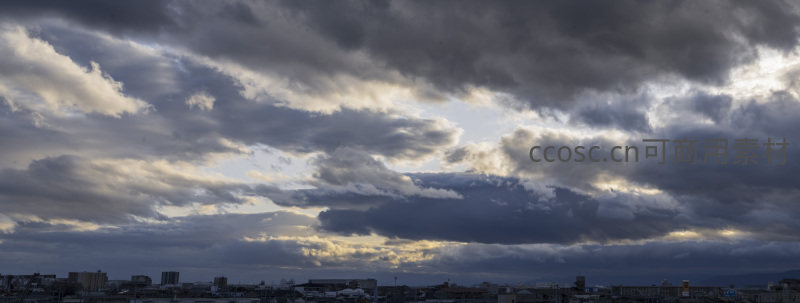 宽幅视角捕捉城市地平线上方的云层动态,深灰与亮白云块交错,光线在云底勾勒出柔和边缘,呈现宏大的自然画卷。