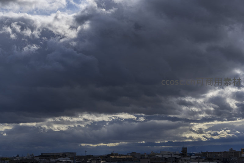 巨大的积雨云笼罩城市上空,底部阴沉压抑,顶部被阳光照亮,形成强烈视觉冲击,预示着一场风暴即将到来。