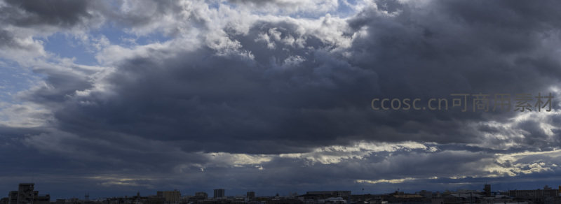 广阔的天空布满翻滚的积雨云,预示着一场暴雨即将降临,城市在巨大的云团下显得渺小而静谧。