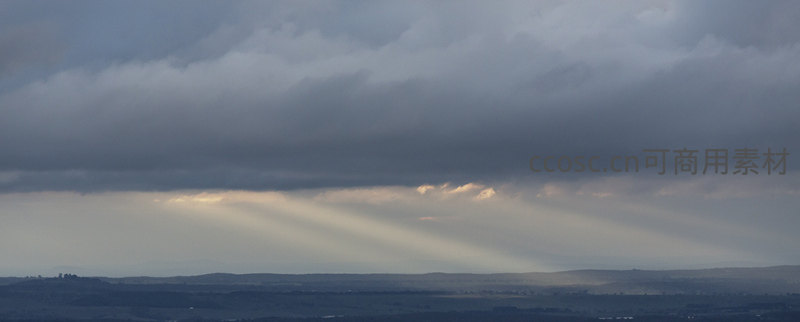 一束束金色的光线从厚重云层的缝隙中倾泻而下,照亮了远方的原野,营造出宁静而神圣的氛围。