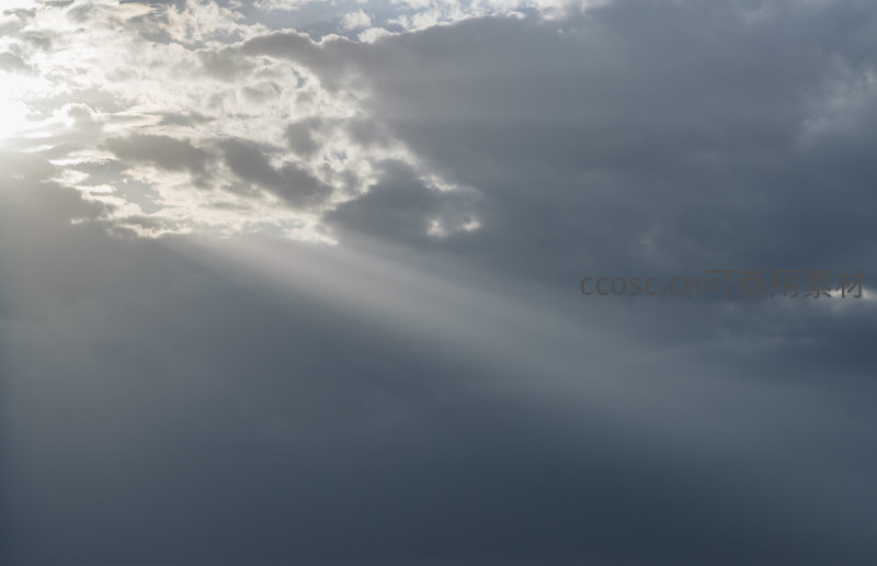 一束强烈的斜射光柱从云层边缘倾泻而下,穿透厚重的灰暗云团,如同自然之笔在天空画布上挥洒出戏剧性的光影对比。