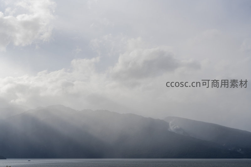 阳光穿透薄雾轻抚湖面与远山,水天一色间云气氤氲,营造出如诗如画的静谧意境,令人心旷神怡。