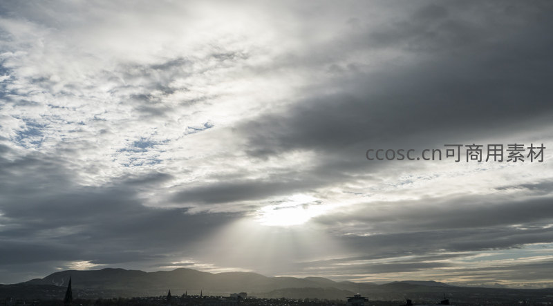 厚重云层中透出耀眼阳光,光束洒向远方的城市与山峦,明暗对比强烈,营造出戏剧性光影效果,展现自然与城市的交融之美。