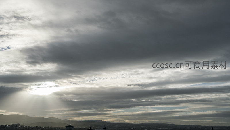 厚重的云层中,一束阳光穿透而出,洒向下方的城市与连绵山脉,营造出戏剧性的光影效果,展现自然的壮丽与宁静。
