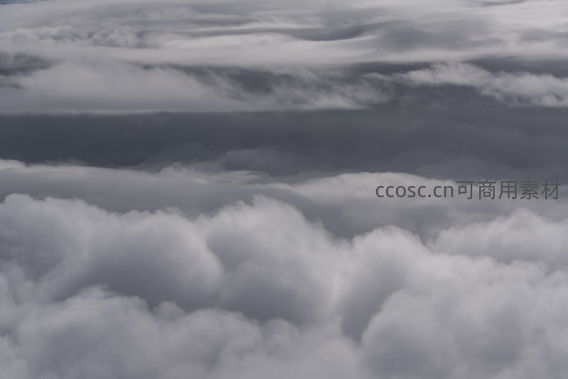 从飞机或高处拍摄的云层,如无垠的海洋般翻涌起伏,灰白相间的色调与柔和的边缘,展现出大自然鬼斧神工般的动态美感。