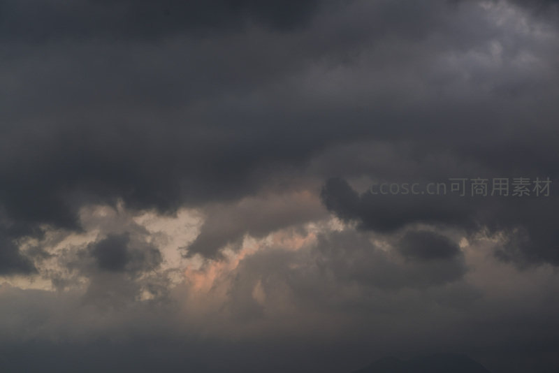 厚重的乌云覆盖天际,缝隙中透出温暖的夕阳光芒,营造出戏剧性的自然光影效果,预示着天气的变幻。