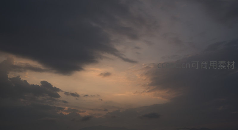 天空中云层被夕阳染成金橙色调,与深灰云块交织,形成柔和而富有层次感的暮色景象,令人沉醉。