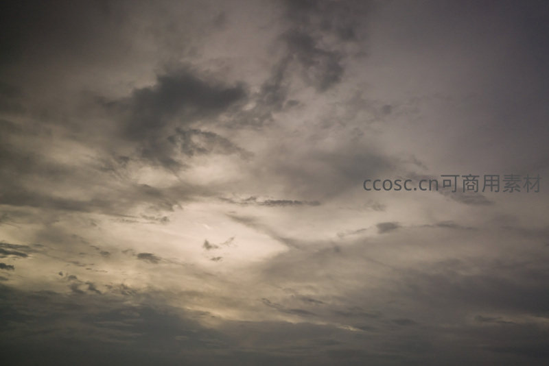 浓密云层中裂开一道缝隙,柔和光线倾泻而下,照亮部分云体,形成强烈的明暗对比,宛如天空中的神圣启示。