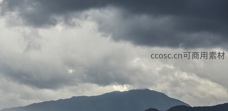 厚重的乌云低垂,几乎压到连绵起伏的山峦之上,山体轮廓在灰暗天幕下若隐若现,营造出一种压抑而壮阔的自然景象。