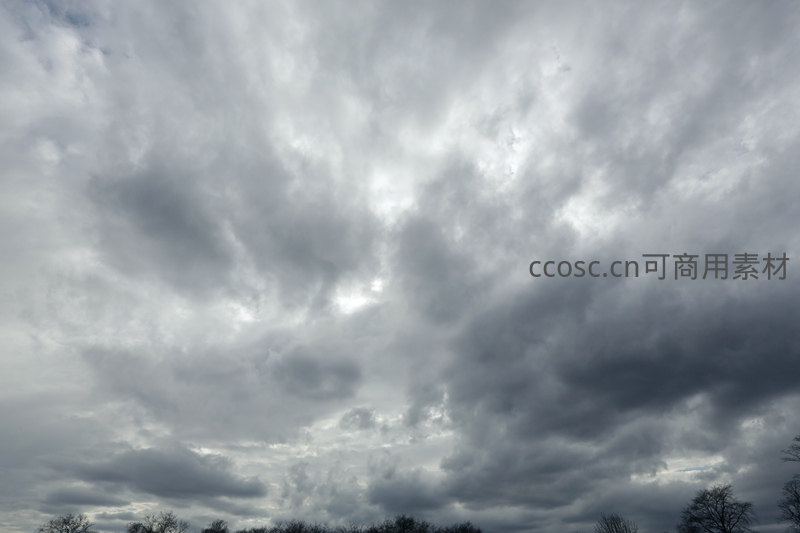 天空被浓密的灰色云层完全覆盖,仅在缝隙中透出微弱光线,下方树木剪影清晰,整体色调沉郁,营造出宁静而略带忧郁的氛围。