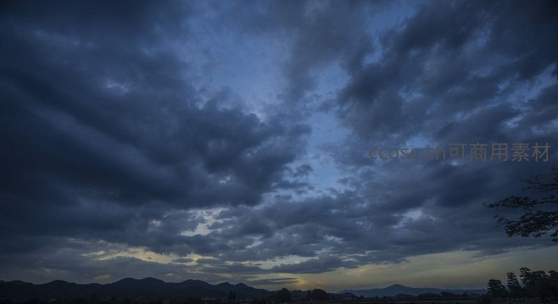 深蓝与灰黑交织的厚重云层笼罩天际,远方山峦轮廓在微光中若隐若现,营造出宁静而略带压抑的黄昏氛围。