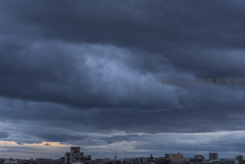 巨大的风暴云团悬停在城市上空,压得楼宇显得渺小,云层缝隙透出的微光为钢筋水泥森林增添了一丝神秘与紧张的氛围。