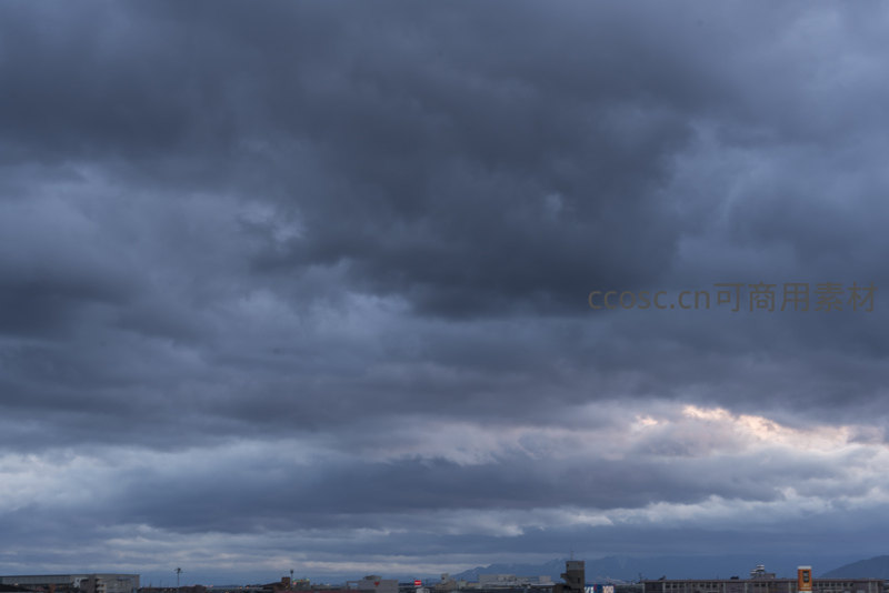 厚重的乌云密布天空,城市建筑轮廓在下方若隐若现,预示着一场暴雨即将来临,整个画面充满压抑与动感。
