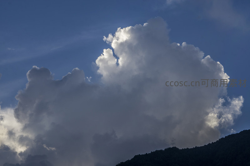 洁白蓬松的积云漂浮在湛蓝的天空中,下方是深绿色山峦的剪影,构成一幅清新开阔、充满生机的自然画卷。