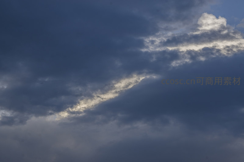 大片深蓝色的云层铺满画面,一条狭长的、被阳光照亮的云带斜贯其中,形成强烈的视觉引导线,宛如一幅充满动感与韵律的天然抽象画作。