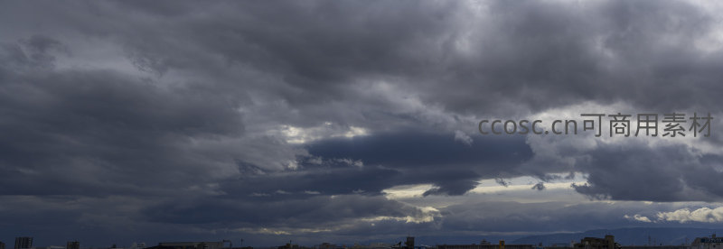 大片乌云悬停于城市上空,将楼宇笼罩在灰暗阴影之中,仅有的几缕阳光穿透云层,勾勒出建筑轮廓,营造出一种末日前的宁静与压迫感,引人深思。