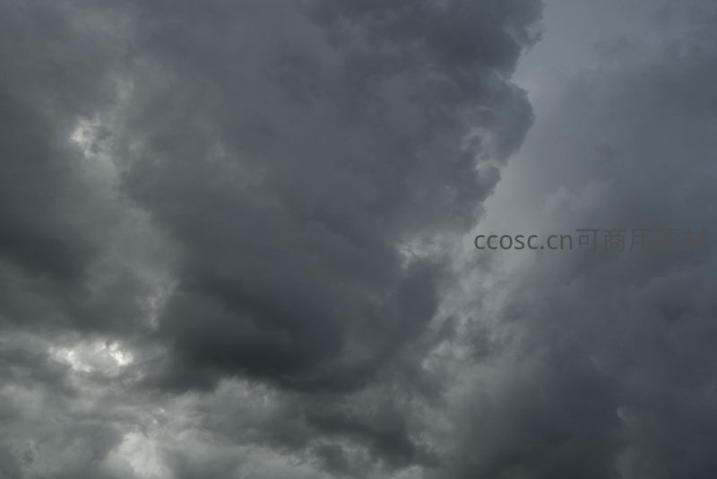 巨大的积雨云块堆叠耸立,形态如山,云层间偶然裂开的缝隙透出微光,形成强烈的明暗对比,暗示着风暴中的片刻希望与力量。