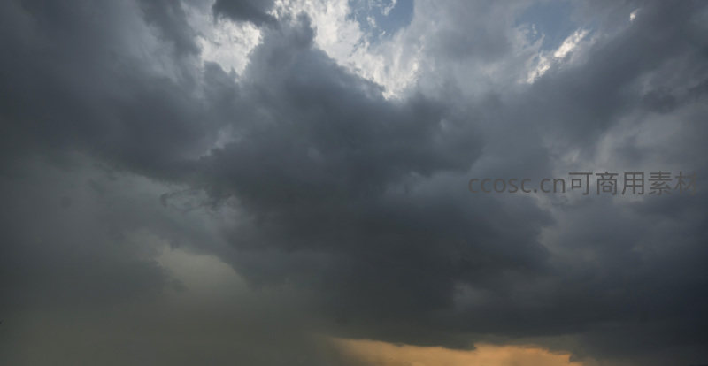 厚重的乌云笼罩天际,边缘透出微弱的夕阳金光,城市轮廓在阴沉背景下若隐若现,营造出压抑而壮丽的氛围。