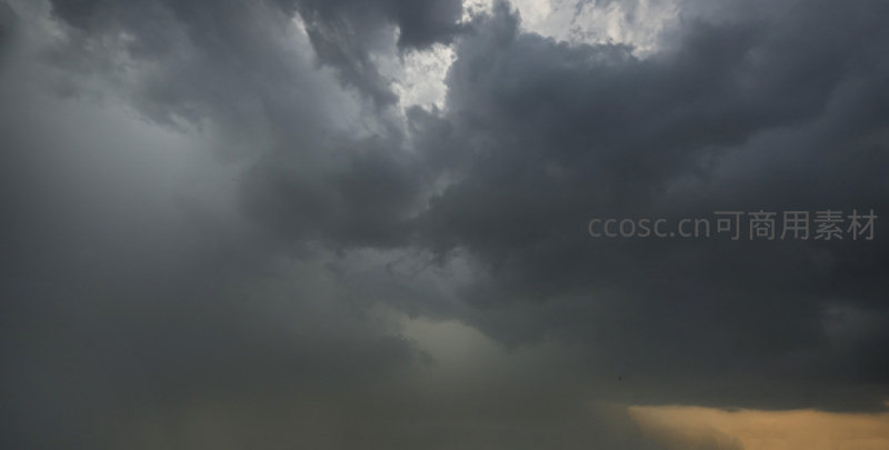 浓重的积雨云层层叠叠,气势磅礴地翻滚移动,一束暖光从云隙间斜射而下,形成强烈的明暗对比,充满视觉冲击力。