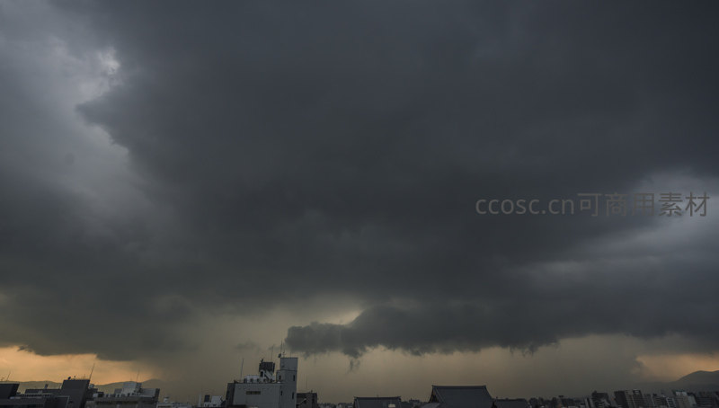 巨大的黑色云团低垂覆盖整个城市,远处山脉轮廓在雨幕中若隐若现,近处屋顶与楼宇在昏暗天光下静默,等待雨水倾盆而至。