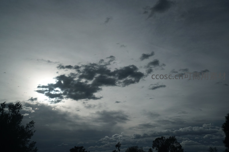 太阳从浓密云层后透出光芒,光线如利剑般刺破灰暗,树梢剪影衬托出宁静而充满希望的清晨氛围,象征光明终将战胜阴霾。