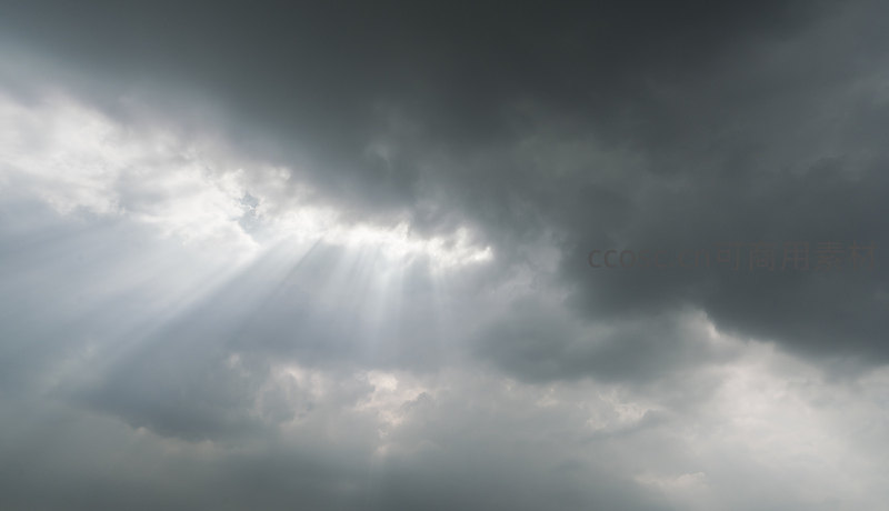 浓密的乌云中裂开一道缝隙,金色的阳光如利剑般刺破黑暗,形成壮丽的耶稣光效果。这戏剧性的光影对比象征着希望与突破。