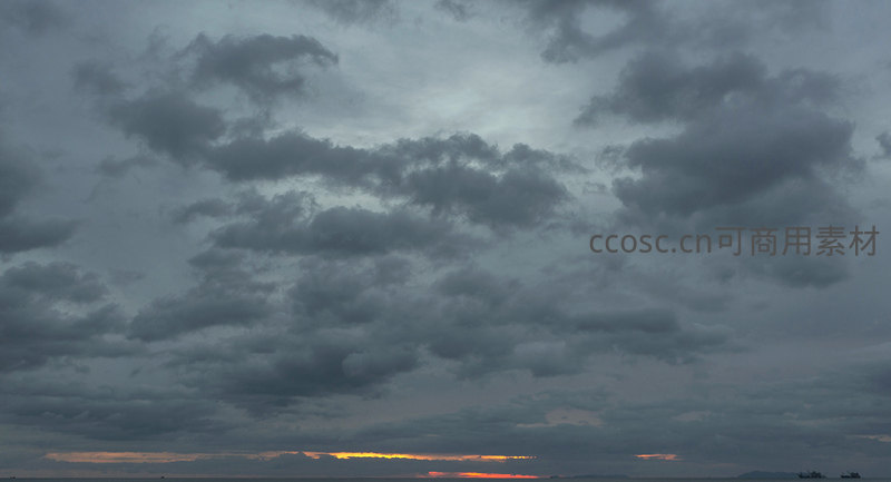 夕阳西下,云层染上橙红霞光,与深灰云朵交织成壮丽画卷,远处地平线静谧安详,令人心旷神怡。