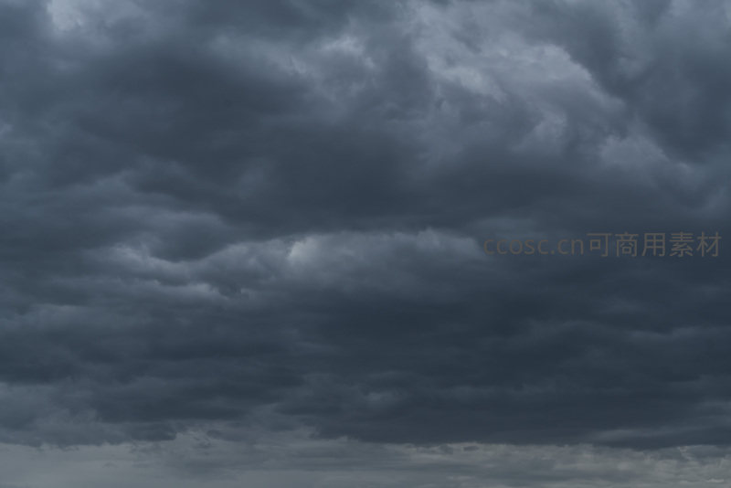 整片天空被浓密厚重的云团填满,颜色由灰至黑渐变,云层间偶有微光透出,是典型暴风雨来临前的景象,充满戏剧性张力。