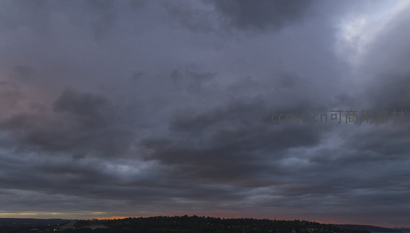 低垂的云层笼罩着远处的城市轮廓,地平线处透出微弱的橙红光芒,整个画面宁静而辽阔,展现出都市边缘独有的黄昏美感。