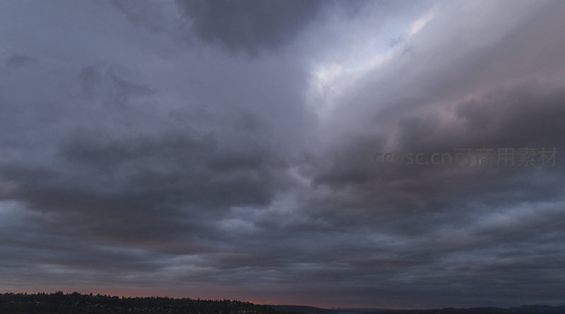 低垂的乌云笼罩城市天际线,远处山峦与建筑轮廓模糊,仅地平线处残留一抹暖色,展现都市在自然力量下的静谧与敬畏。
