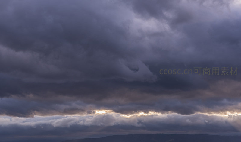 乌云密布天际线,霞光穿透云层缝隙