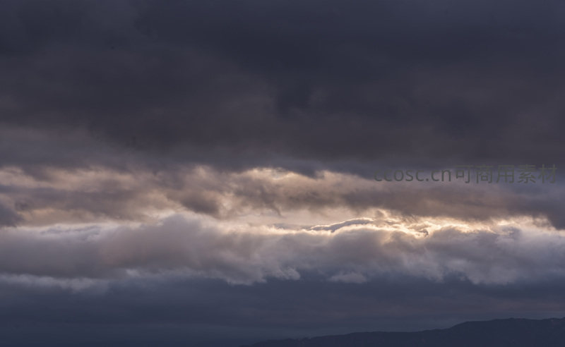 深沉的暮色中,翻滚的云海被夕阳染上金边,层次分明的云层在光线映衬下展现出壮阔而神秘的自然景象。