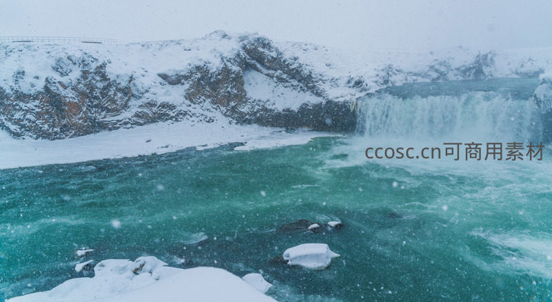 雪花纷飞中,碧绿河水自雪覆山崖奔涌而下,形成一道壮美瀑布,水雾弥漫,营造出如诗如画的冬日仙境。