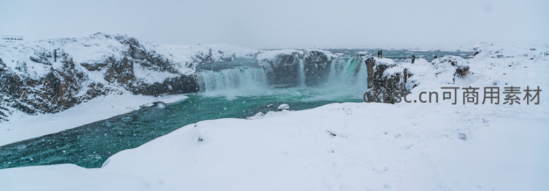 从远处眺望,被白雪覆盖的峡谷中,瀑布如玉带般蜿蜒流淌,几位游客点缀其间,更显自然之宏大与人类之渺小,意境深远。
