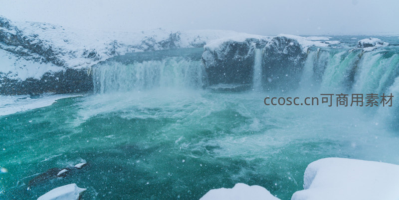 湍急的碧绿色水流从雪覆的悬崖倾泻而下,激起层层白色水雾,与飘落的雪花交织,展现出冬季自然力量的雄浑与壮美。