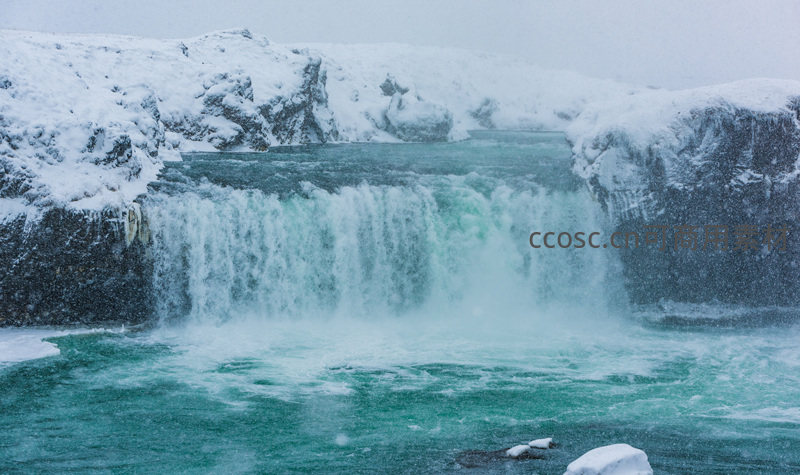 在广袤无垠的雪原上,一道宽阔的瀑布如巨龙般奔腾咆哮,清澈的碧水与洁白的冰雪形成强烈对比,尽显大自然的鬼斧神工。