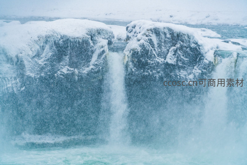 高耸的雪崖间,瀑布如白练垂落,溅起的水雾与漫天飞雪融为一体,营造出如梦似幻、超凡脱俗的冰雪仙境氛围。