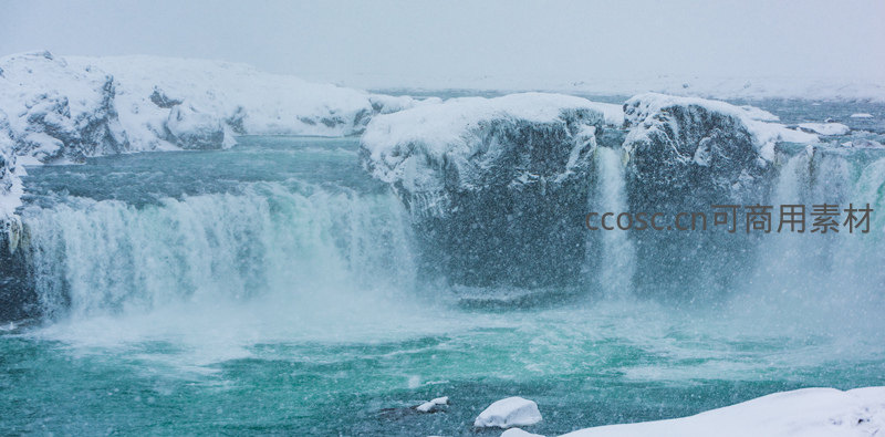 在皑皑白雪的包围下,湍急的瀑布从覆雪的岩壁倾泻而下,碧绿河水与白色雪景形成鲜明对比,展现大自然的壮丽与严酷。