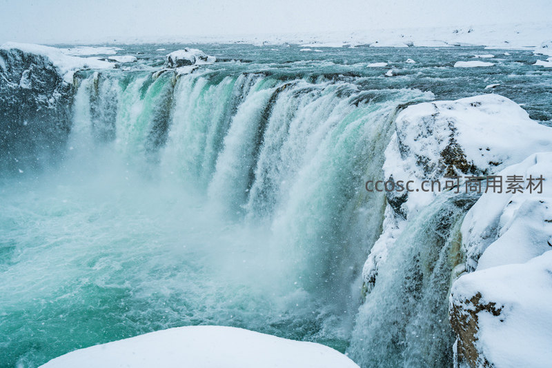 飞流直下的瀑布被白雪环绕,水花四溅如雾,在寒冷空气中弥漫,岩石边缘积雪厚重,构成一幅动静结合、冷峻壮美的自然画卷。