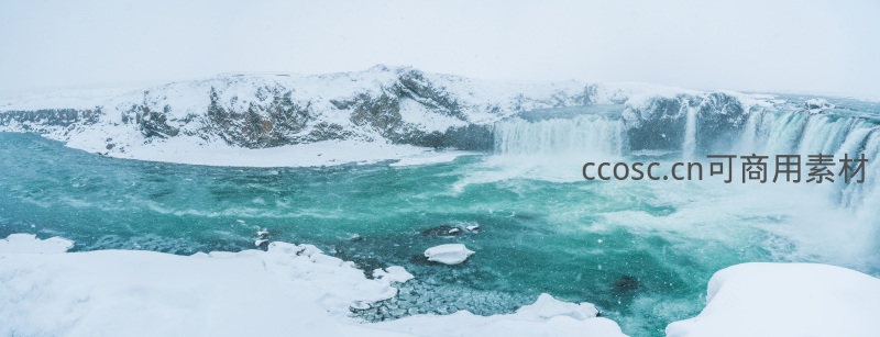 广角镜头捕捉到整片雪原与奔腾瀑布的壮阔景象,碧绿色河水蜿蜒流淌,远处山峦覆雪,近处水雾蒸腾,尽显北国冬日雄浑之美。