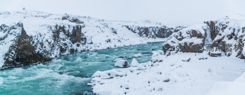 宽阔的雪域峡谷中,碧绿色的河水汹涌奔腾,两岸峭壁被白雪覆盖,水花四溅,气势磅礴,是冬季自然奇观的绝佳写照。