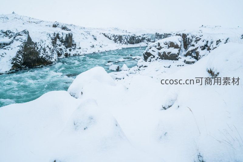被白雪覆盖的峡谷间,一条碧绿色的激流蜿蜒穿行,水花飞溅,与静谧雪景形成强烈对比。